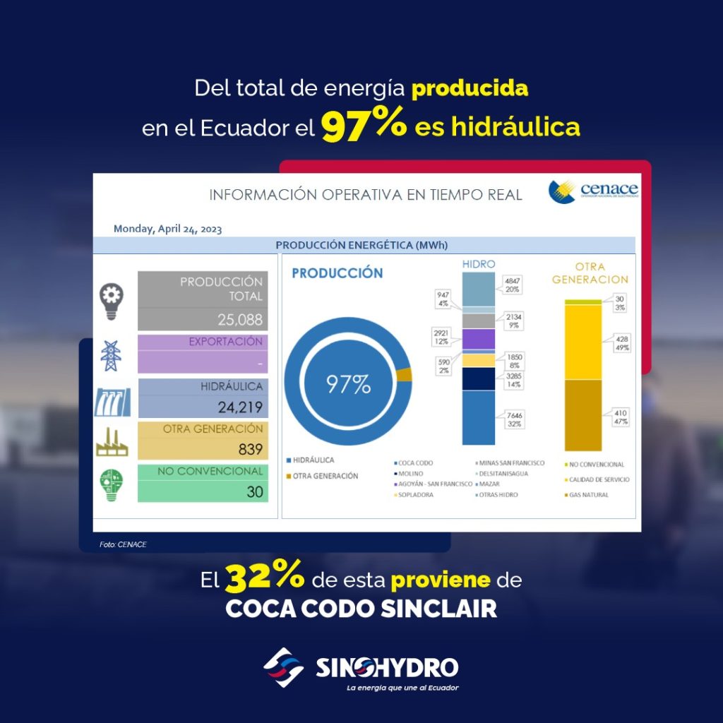 En Marzo la energía hidroeléctrica del Ecuador alcanzó el 97% del total y de esta 32% pertenecía al Coca Codo Sinclair