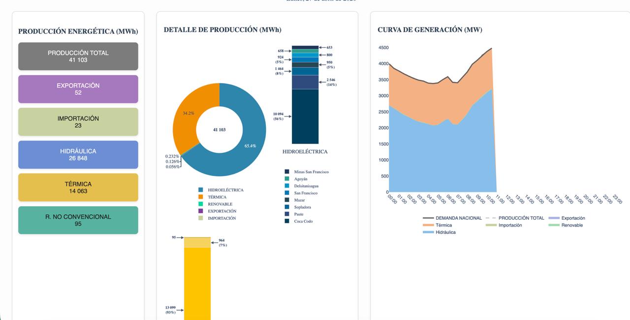 Hasta las 11:00 de este 27 de abril de 2026, Coca Codo Sinclair estaba generando el 56% de la energía hidroeléctrica del país, reafirmando su rol clave dentro de la matriz energética nacional. Su capacidad de producción no solo garantiza el suministro continuo de electricidad, sino que también contribuye a la estabilidad del sistema.